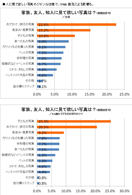 「家族、友人、知人に見て欲しい写真は?」との問いに対して、「おでかけ、旅行の写真」「街並み・風景写真」と答えた人が合わせて、37.8%という結果で、外出時の写真を見せたい人が多いのは普遍と言えそうです。