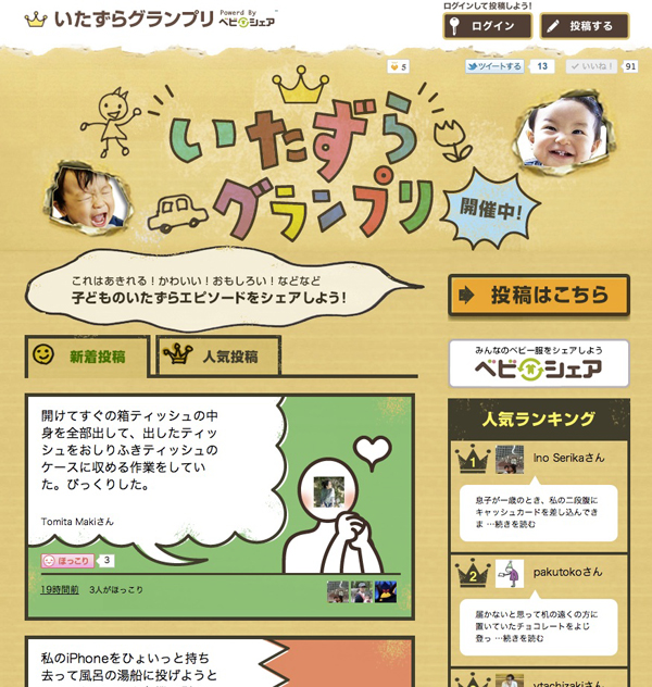 2011年12月からベビシェアでは「いたずらグランプリ」という投稿型コミュニティサービスを開始。これは「みんなのこどものいたずらを見てほっこりしたい」というユーザーの隠れた要望を反映し、モノだけでなくエピソードもシェアできるようにしたもの。