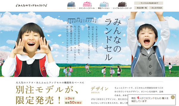 どれだけ商品に興味をもっているのかがひと目でわかる機能付き。トップページに飛ぶと、「現在○人がこのランドセルの購入を検討しています」とポップアップが出ます。