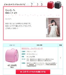 例えば、離れて暮らす、おじいちゃんやおばあちゃん。買いたい商品URLにメッセージと成長した子供の写真をつけて、メールを送信。初めての特別なランドセルを、おじいちゃんおばあちゃんからの大切な贈り物として、おねだりしてみることができます。