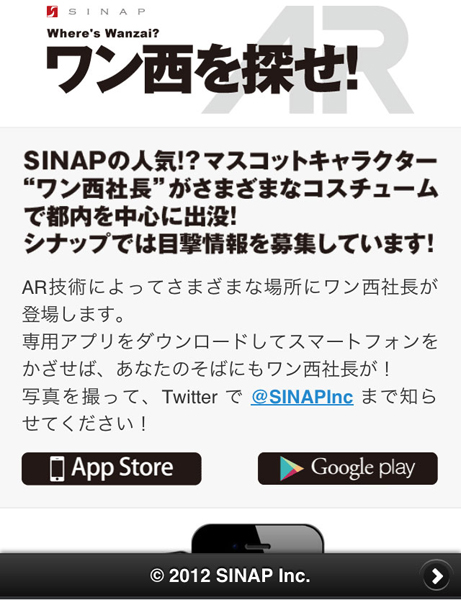 同アプリは、シナップのマスコットキャラクターである犬の「ワン西(ワンザイ)社長」をAR(拡張現実)と位置情報機能を使い、さまざまなところに出現させ、写真を撮ることができる、というアプリ。
