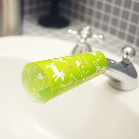 洗面所などの蛇口に取り付け、蛇口を5~10cm程度延長することで、約1歳~6歳の子どもと保護者が楽しく快適に手を洗えるアイデアグッズ。色柄は新柄含め、4種類。今回の新柄はハチや海の生き物の明るい絵柄で、「楽しい手洗い」を演出する。今回の商品は、2012年5月に開催されたアイデアコンテストで一般のママが応募したグランプリ受賞アイデアを商品化したもの。
