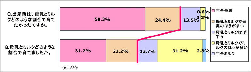 出産前には全体で8割の母親が母乳を中心(完全母乳、母乳のほうが多い)にしようと考えていましたが、母乳中心の授乳を実践できたのは全体の5割程度となりました。