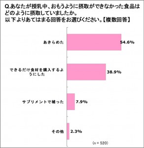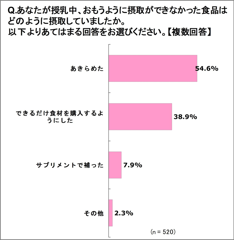 そこで、「授乳中、思うように摂取ができなかった食品はどのように摂取して(補って)いたか」と尋ねると、「できるだけ食材を購入するようにした」が38.9%、「サプリメントで補った」が7.9%、そして半数以上の54.6%で最も多かったのは「あきらめた」という回答。世代別で見ると「あきらめた」と回答したのは30・40代がともに6割を超える結果となりました。一方20代で「あきらめた」と回答した人は35%と、全世代の中で最も低く、できるだけ食材を購入したり、サプリメントで補うなどの対応をしているということがわかりました。サプリメントなどで手軽に栄養補給をするのが若い世代のスタンダードになりつつあるようです。